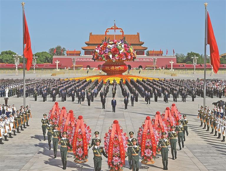 庄严的天安门广场上,鲜艳的五星红旗高高飘扬,人民英雄纪念碑巍然矗立。广场中央,“祝福祖国”巨型花篮表达着对祖国繁荣昌盛的美好祝愿。纪念碑北侧,两组花坛上白菊等鲜花组成的18个花环,寄托着全体中华儿女对英烈的深情追思。