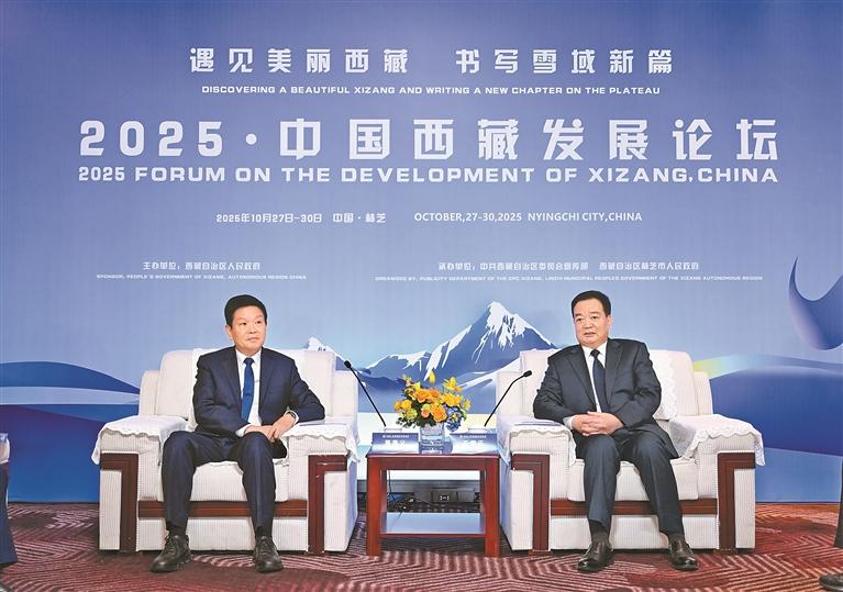 10月28日至29日,自治区党委书记王君正在林芝先后与参加2025·中国西藏发展论坛的嘉宾和国内专家学者代表座谈。这是王君正与同济大学党委书记郑庆华座谈。本报记者 旦增西旦 摄