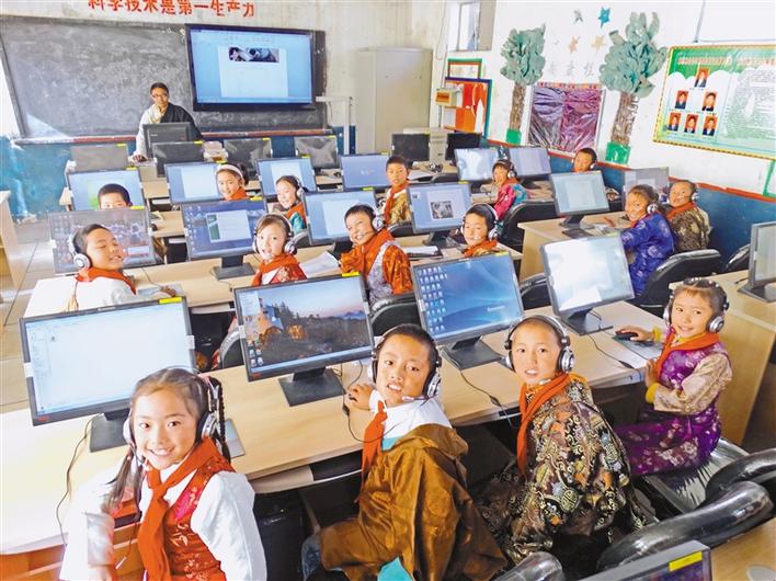 日喀则齐鲁小学教育信息化发展只是我区教育信息化发展的一个缩影。党的十八大以来,随着教育信息化在我区的发展,交互式一体机、远程授课系统、在线教育平台等“互联网+教育”应用,既提高了学习效率,又让孩子们在愉悦的氛围中学到了知识。据统计,截至2019年底,全区中小学建设多媒体教室9484间,覆盖率达73%;建设计算机教室789间,覆盖率达84%;全区中小学校教师拥有计算机的比例达100%,每百名学生拥有的信息化终端数量为8.22台,在全国处于中等水平;在网络攻坚方面,全区已有92%的学校实现了宽带网络接入,其中出口带宽100M及以上的学校占73.36%,通过多方努力,预计今年年底,我区将实现“互联网+教育”中小学校全覆盖。