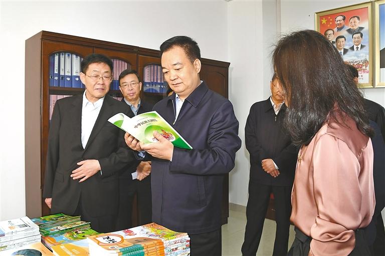 七月五日,自治区党委书记王君正在自治区教育系统调研主题教育开展和全区教育工作情况。这是王君正在自治区教育厅教材工作处了解具体工作开展情况。本报记者 李洲 摄