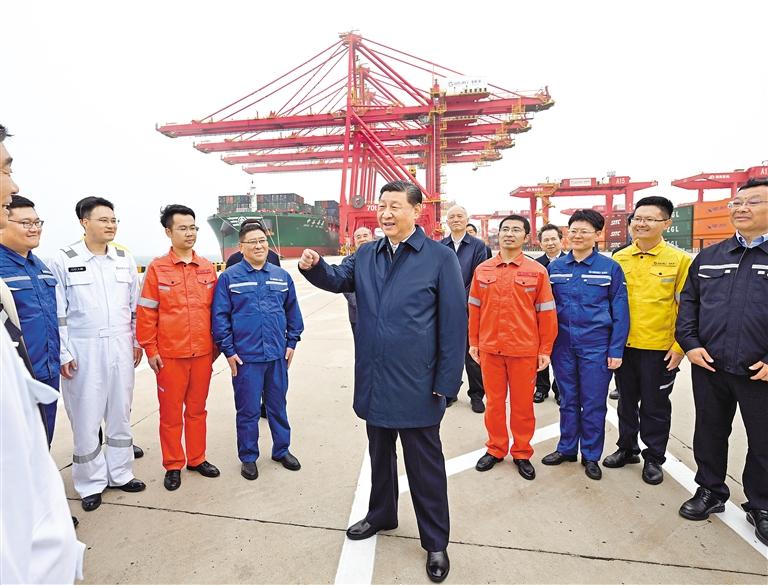 22日下午,习近平首先来到日照港考察。日照港是重要的能源和大宗原材料中转基地,近年来推进智慧化、绿色化建设,建成顺岸开放式全自动化集装箱码头。习近平听取山东省港口发展建设和日照港规划布局等情况介绍,并察看全自动化集装箱码头作业场景。他说,日照港是改革开放后新建的港口,近年来推进科技创新,将传统港口改造升级为现代化港口,不仅货物吞吐量跻身全国前列,还积累了通过传统产业改造升级发展新质生产力的经验,值得肯定。习近平亲切慰问港口科技工作者、运营人员、航运人员,希望大家再接再厉、继续奋斗,推动日照港管理运营更上一层楼。